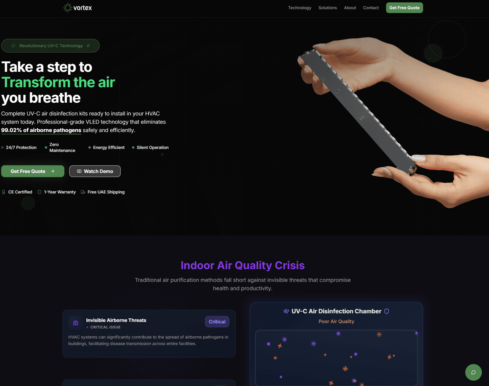 Despite having a revolutionary product, Vortex Biotech struggled with two primary issues: Visual Limitations: Because air purification happens internally and microscopically, there was no "hero shot" that demonstrated the product's value. Brand Perception: The existing digital presence felt overly clinical and "sterile." It lacked the emotional resonance needed to appeal to homeowners (B2C) while remaining sophisticated enough for facility managers (B2B).